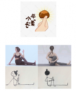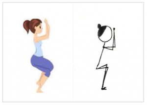 我们可以借助于瑜伽小人的头发/丸子头表示头部或者身体扭转的方向/视线的方向,你也可以加上瑜伽小人的眼睛,鼻子,嘴巴,表示瑜伽小人的面部方向。